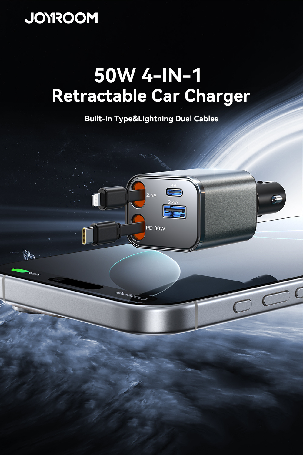 Deze ultracompacte 4-in-1 autolader is dé oplossing voor wie vaak onderweg is. Dankzij de slimme combinatie van een uittrekbare 80 cm Type-C en Lightning-kabel, plus extra USB-C en USB-A poorten, laad je tot wel vier apparaten tegelijk op – en dat supersnel. Perfect voor gebruik in zowel auto's als vrachtwagens (12V-24V).