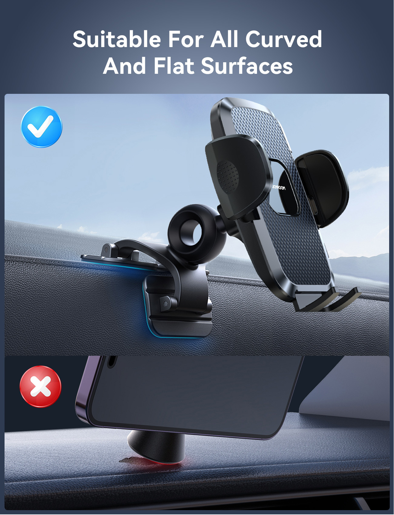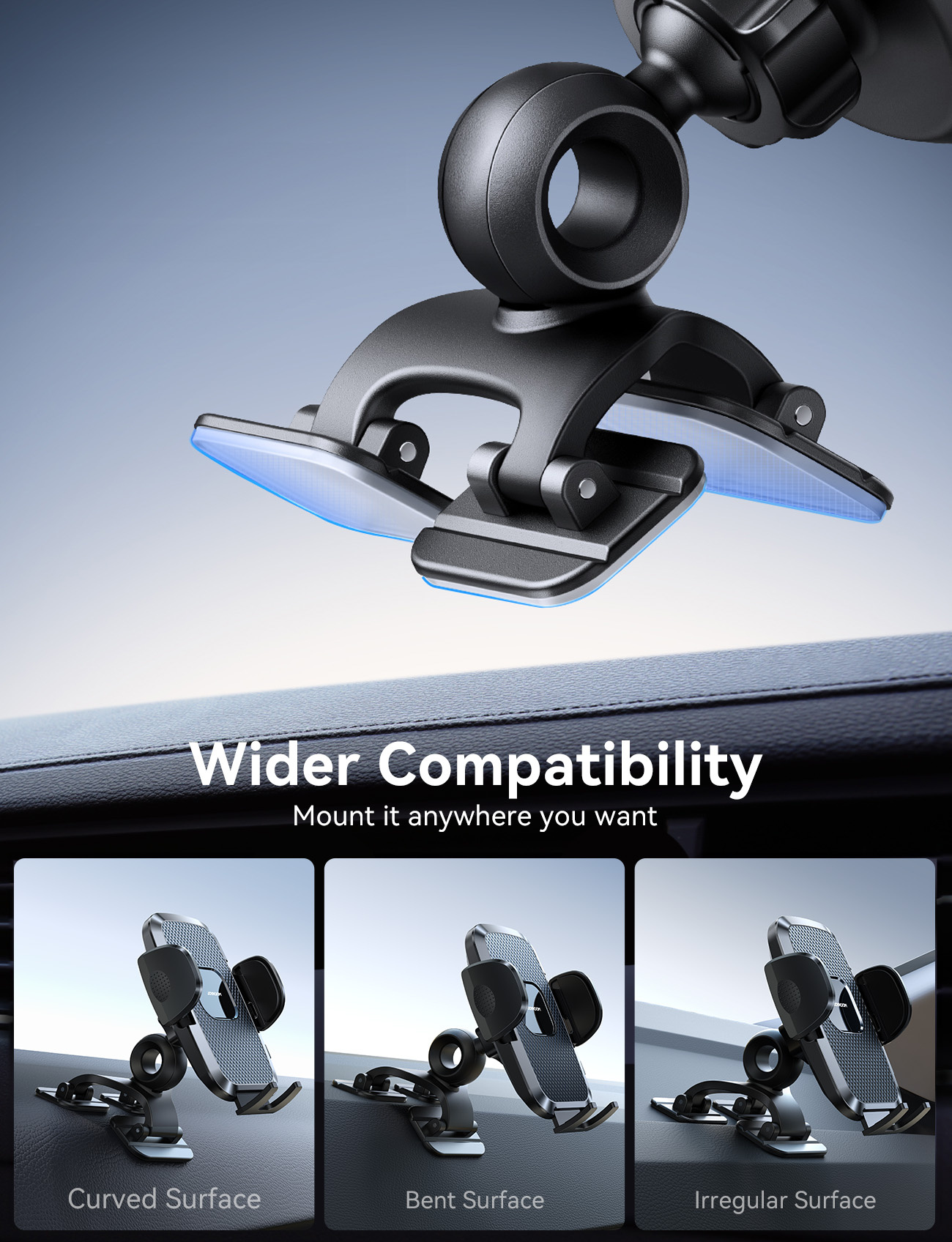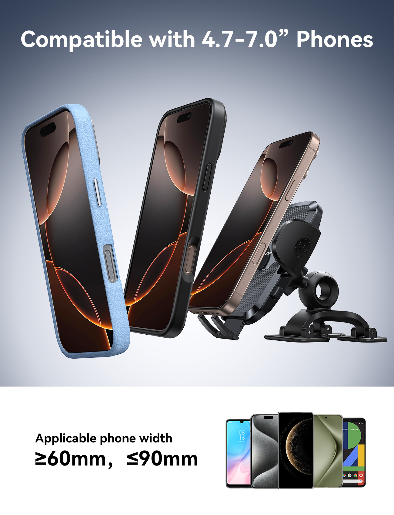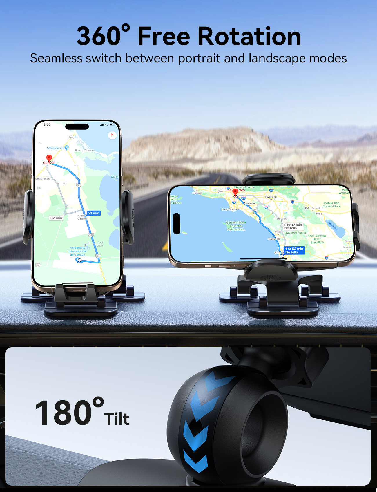 Zoek je een veilige, stabiele én handige oplossing om je smartphone in de auto te gebruiken? Deze universele telefoonhouder is ontworpen voor maximaal gebruiksgemak, met éénhandige bediening, stevige grip en volledige rotatie. Met één druk op de knop open je de houder, en klem je je telefoon stevig vast door de armen aan beide zijden in te drukken – zonder schokken of trillingen tijdens het rijden. Dankzij de verstelbare basis is deze houder geschikt voor vrijwel alle smartphones van 4.7 tot 7.0 inch – inclusief iPhones, Samsungs en andere merken. De drie krachtige kleefpads zorgen voor een stabiele bevestiging op het dashboard of raam, zelfs bij hobbelige ritten. De houder is ontworpen voor gemak onderweg. Je bevestigt of verwijdert je telefoon eenvoudig met één hand – ideaal voor veilig gebruik tijdens het rijden. Stel de houder af zoals jij wilt: horizontaal voor navigatie, verticaal voor gesprekken of muziek. De flexibele draaibare kop maakt het mogelijk.