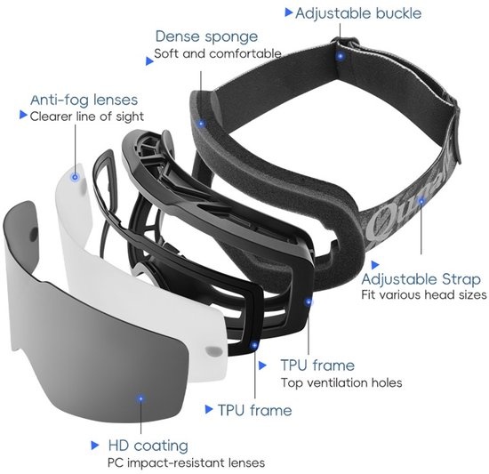 Dankzij het slimme ontwerp draag je de bril moeiteloos over je eigen bril, zonder ongemak of drukpunten. - Comfortabel Design: Voorzien van een drielaagse, ademende schuimlaag die zich aanpast aan de contouren van uw gezicht, biedt deze bril ultiem comfort en voorkomt hij wind en kou.