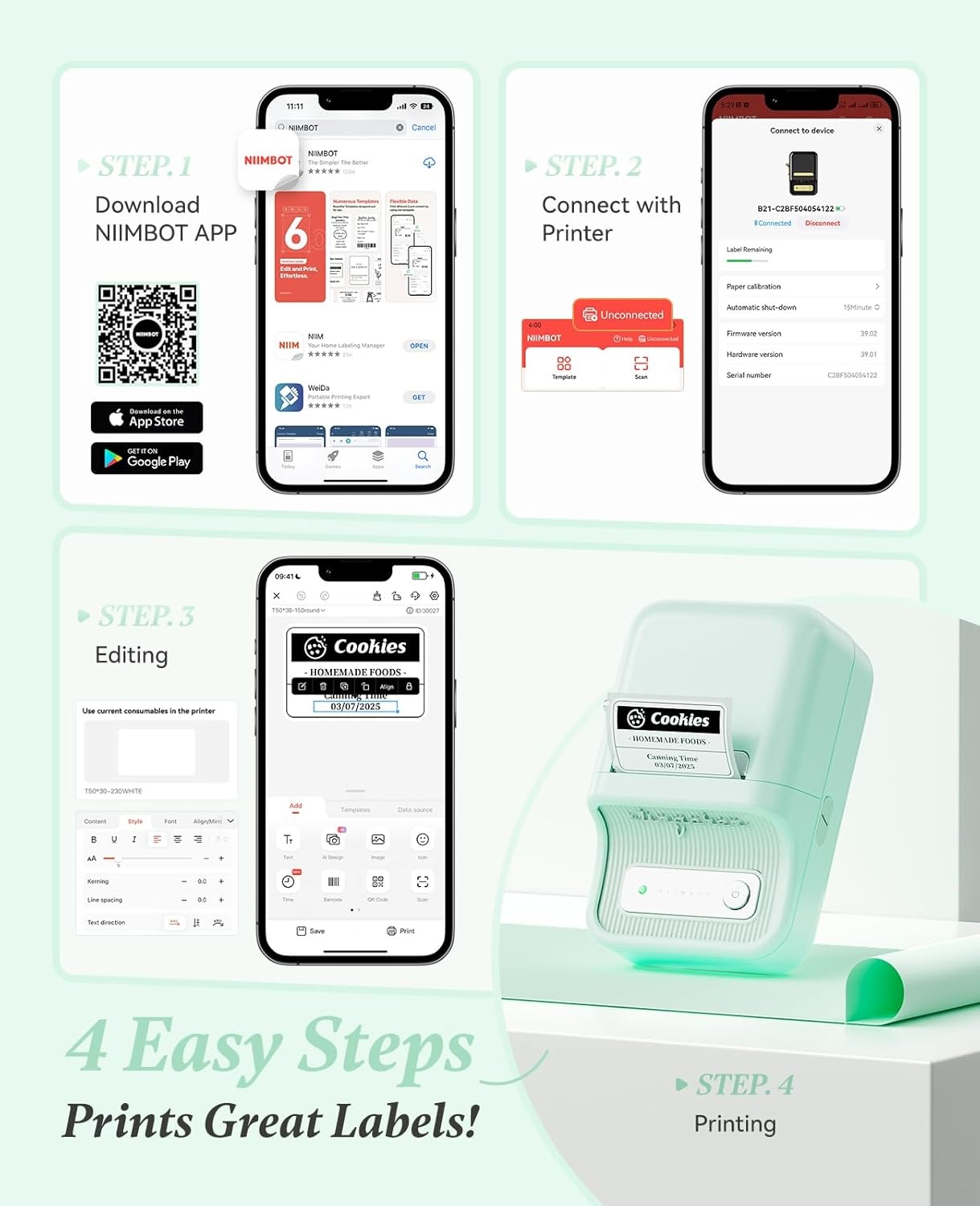 Niimbot B21 - Labelprinter - Draadloos - printbreedte 25-50mm - direct thermisch - 203dpi - 1500mAh - Mint Groen