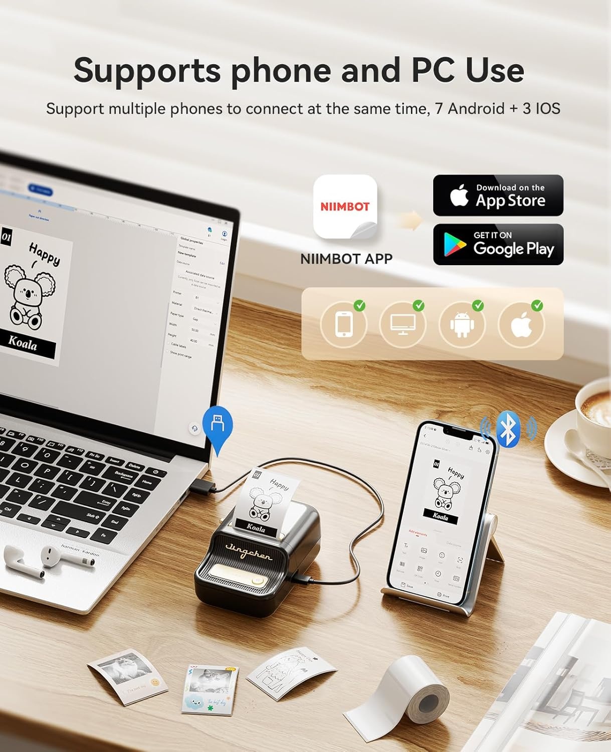 Werkt via Bluetooth met Android en iOS smartphones. Ook te gebruiken op pc via USB-aansluiting (NIIMBOT software vereist). Let op: niet compatibel met iPad.