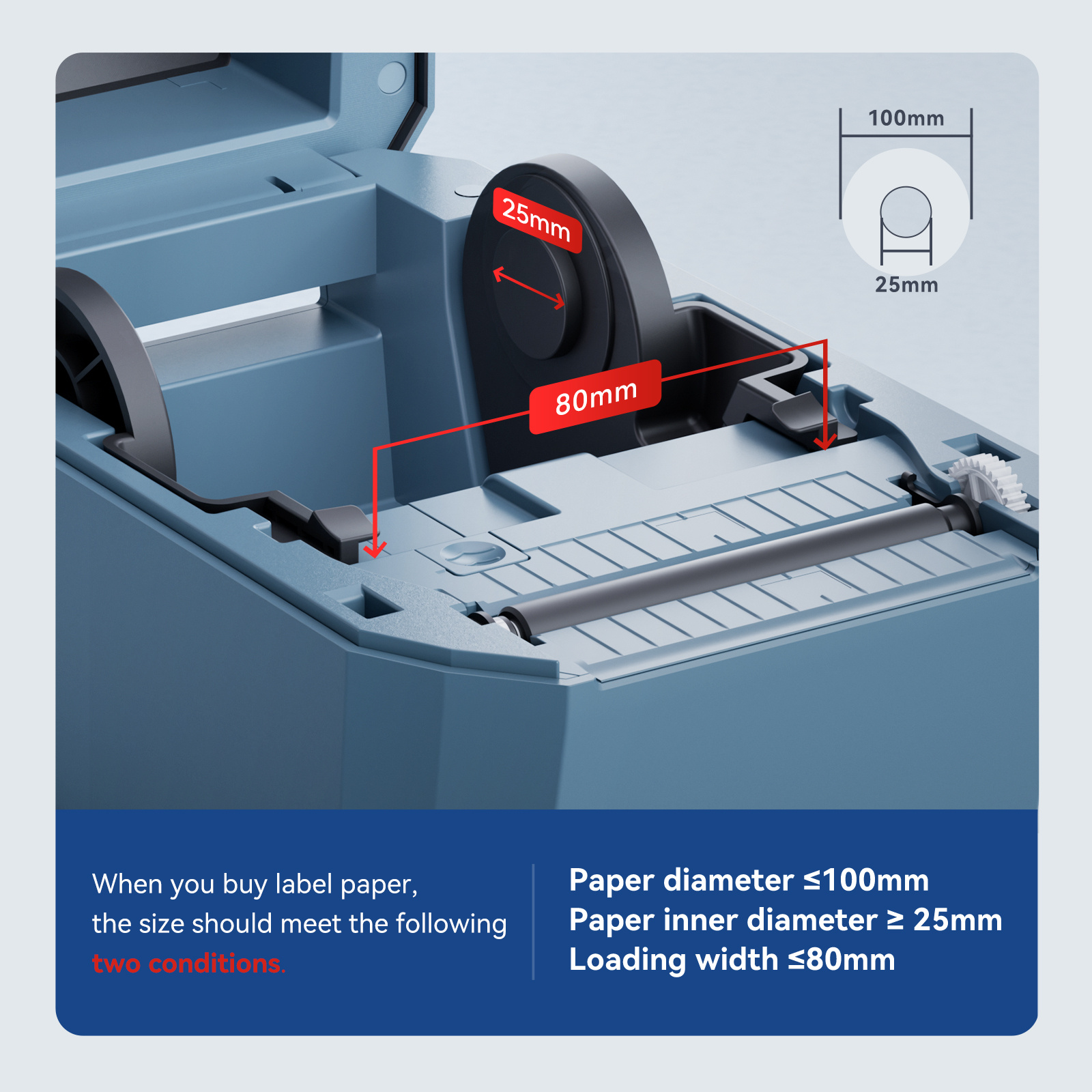Deze 3 inch labelmaker ondersteunt de breedte van labels van 0,85 - 3,14 inch. Met de K3-labelprinter kan worden afgedrukt met een maximale snelheid van 180 mm/s. En hij kan 150 labels per minuut afdrukken. Ongetwijfeld kan onze Bluetooth-labelprinter voor barcode u helpen efficiënter en comfortabeler te werken. Wordt geleverd met een grote rol labeltape van 50 * 30 mm.