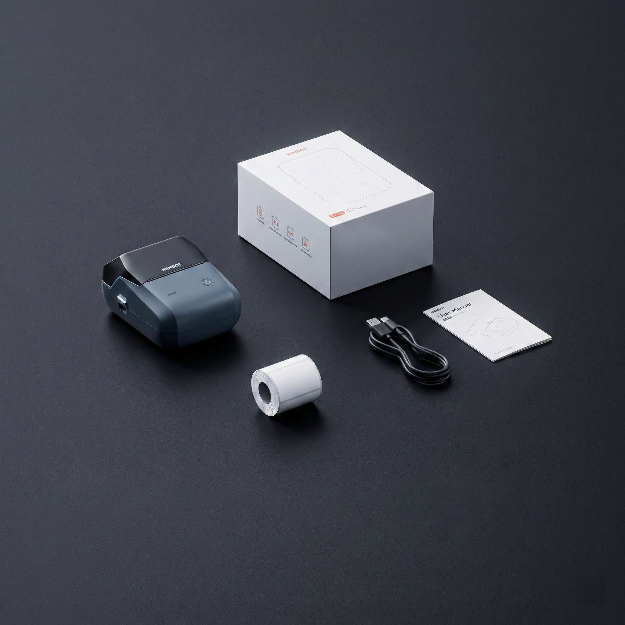 Our printers come with everything you need to get started. The printer itself, a manual, charging cable and a label roll.